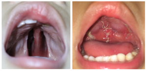 • Có lỗ rò ở vùng vòm miệng hoặc thức ăn trào lên mũi khi ăn.